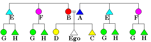 The diagrams are drawn in relation to the Ego, or self; in the diagram above the Ego is the triangle right below the marriage symbol (=). The triangles represent males, circles females. The level adjacent to the Ego would be siblings and cousins, in English. The level above represents parents, aunts, and uncles. Below, we will show the basic kinship classification systems, with diagrams and explanations of what each system is. Each different letter in the diagram represents a different term. Diagrams and short descriptions of each system are shown below.